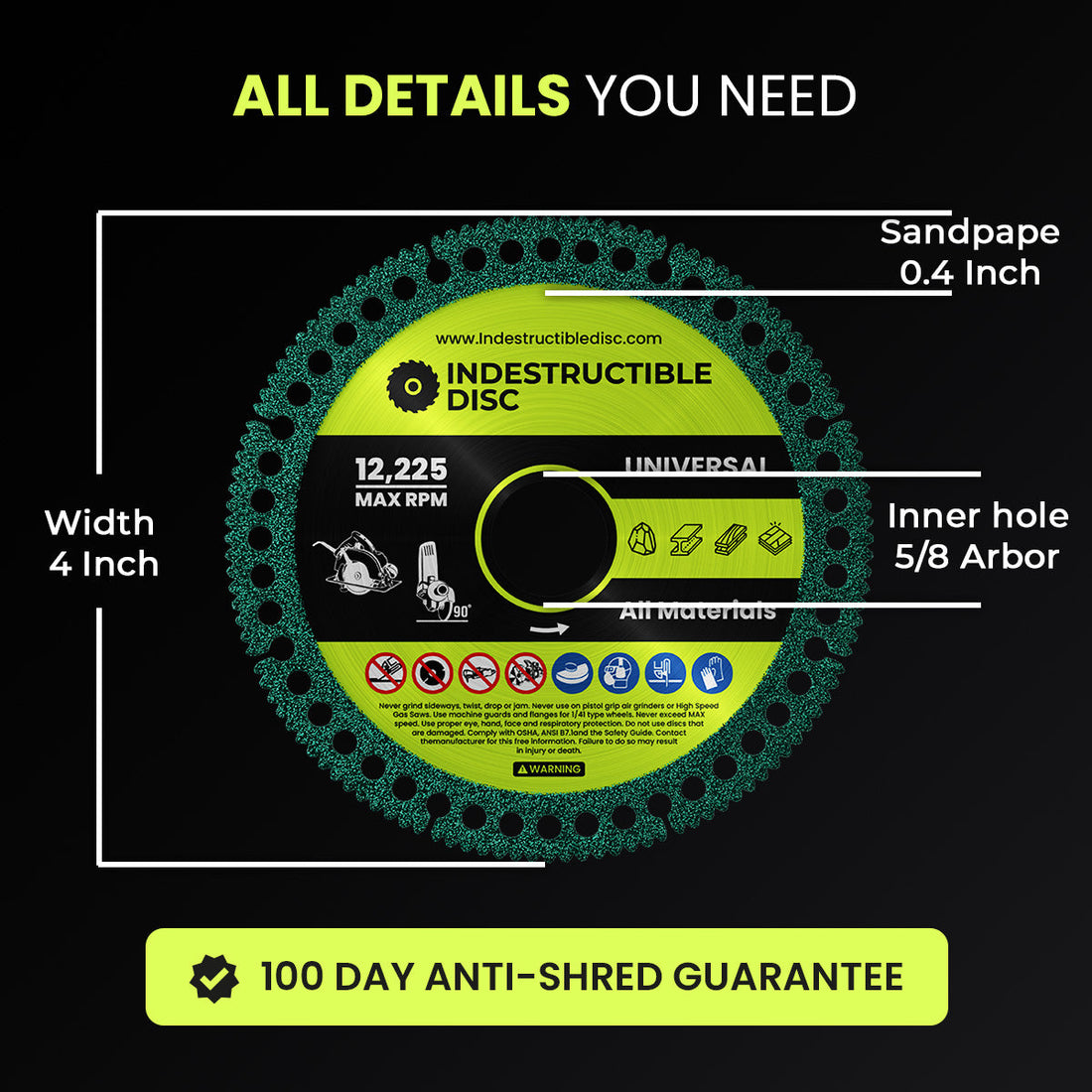 With a 4-inch outer diameter and 5/8-inch arbor hole, the Indestructible Disc™ 2.0 fits all standard angle grinders.